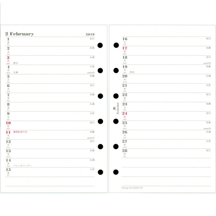・ミニ6穴サイズ・・・約126×80(mm)・期間:2018年10月〜2020年3月 計18ヶ月・枚数:19枚・付録:カレンダー、年代史&年齢早見表、ID/パスワードリスト、月別記録表